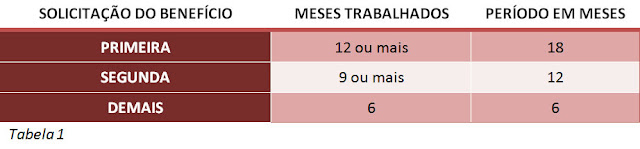 Se o trabalhador já foi beneficiário do seguro-desemprego por uma vez, deverá ter trabalhado por no mínimo 9 meses, nos últimos 12 meses, para poder pedir o benefício. (Esta é a segunda linha da tabela 1).